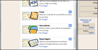 E por fim, para incluir na sidebar a lista dos marcadores, basta irmos em layout, elementos de página, clicar em “adicionar um gadget” e escolher a opção “marcadores”.